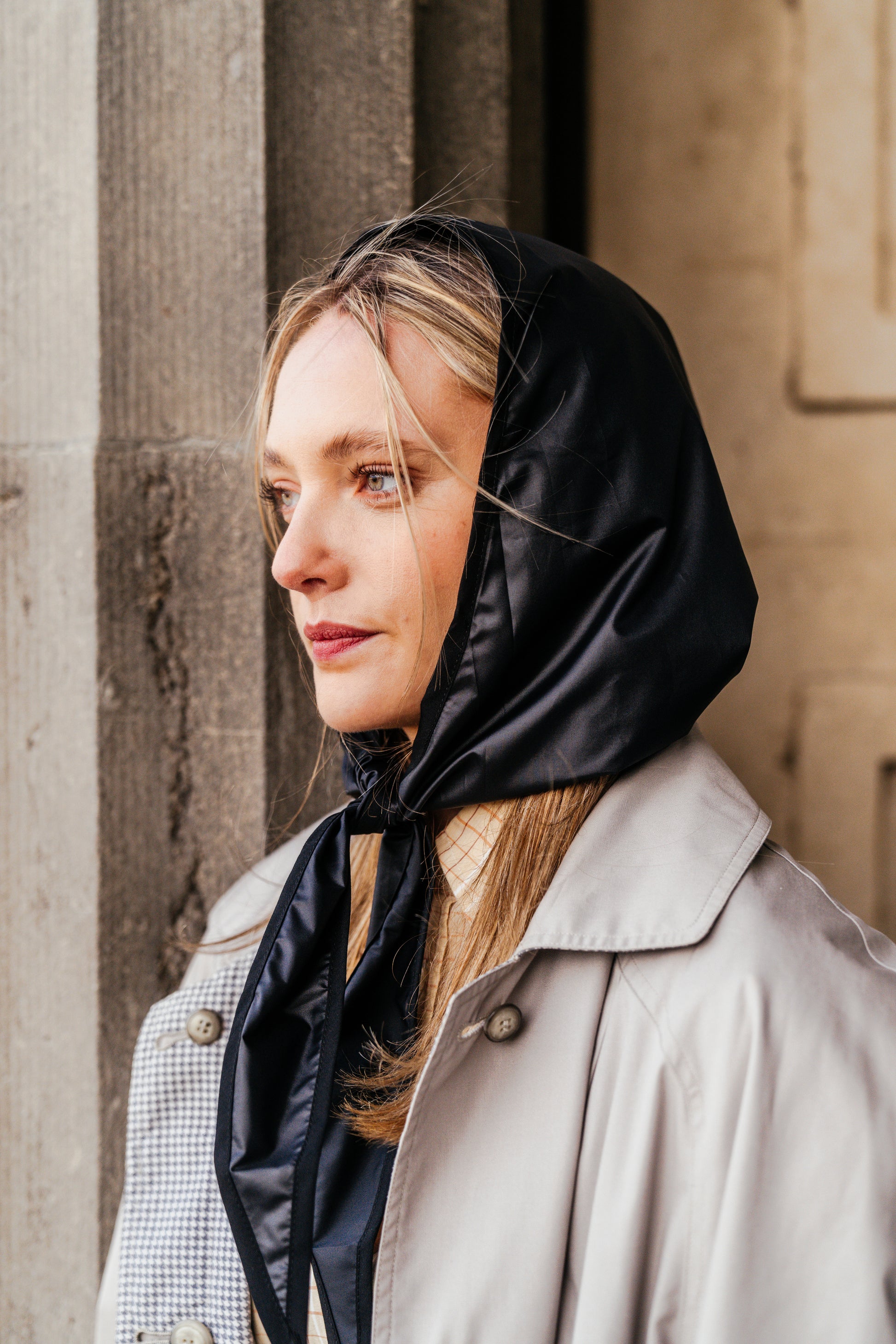 The Coco RAINCAP is the ultimate classic, made from sleek matte black Burberry fabric. Effortlessly chic, it pairs perfectly with a bold red lip for a polished look.